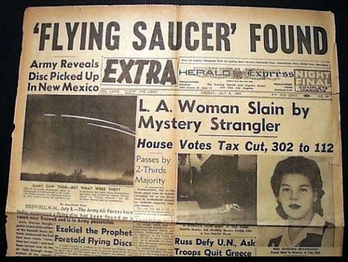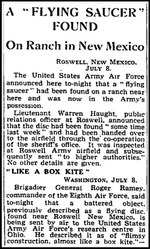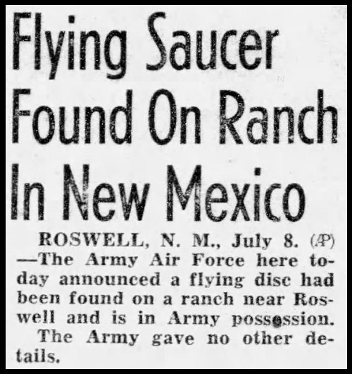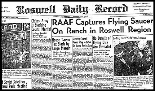 Lawrence R. Spencer: Heinäkuun alussa vuonna 1947 Roswellin kaupungin lähellä New Mexicossa sattui ufon maahansyöksy, lähellä kyseistä lentotukikohtaa. Tukikohta sijaitsi vain noin 160 kilometrin päässä Alamogordosta, jossa ensimmäisten atomipommien testejä tehtiin vuotta ennen toisen maailmansodan päättymistä. Alueella oli siis tehty paljon ydinkokeita. Vaikka ufon maahansyöksystä oli jo tiedotettu radiossa ja sanomalehtien pääotsikoissa, sotavoimat peittelivät sen seuraavana päivänä. He kielsivät koko tapahtuman sanoen sen olleen vain säähavaintopallo. Koko juttu olikin vain muka suuri erehdys.