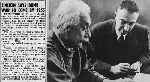 PRINCETON, J. J. – Professori Albert Einstein ja ryhmä työtoveritieteilijöitä sanoivat, että Yhdistyneet kansakunnat olivat kertakaikkisesti epäonnistuneet löytämään suunnitelman atomivalvontaan ja varoittivat, että täysimittainen atomipommisota saattaisi puhjeta kahdeksan vuoden sisällä. Miehet jotka auttoivat luomaan atomipommin ja tietävät mikä saa sen tikittämään, sanoivat että Neuvostoliitolla olisi varmuusvaraston alku pommeja vuoteen 1955 mennessä. [Linkki Wikipedia: Yhdistyneet kansakunnat]