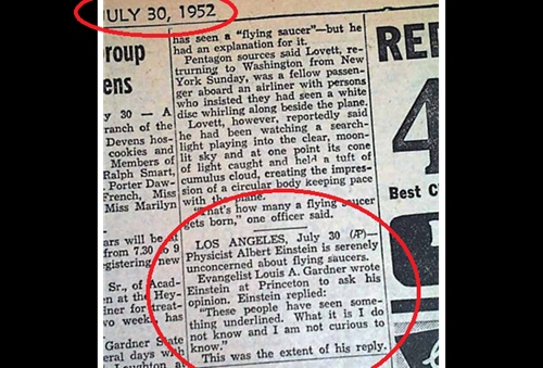 LOS ANGELES – Kuuluisa matemaatikko tohtori Albert Einstein myöntää, että lentävän lautasen katselijat ovat nähneet ”jotain”, mutta häntä ei kiinnosta. Los angelesilainen pappi, pastori Louis A. Gardner, kirjoitti Princetonin tieteilijälle hänen mielipiteestään ilmiöstä. Einstein vastasi: ”Nämä ihmiset ovat nähneet jotain. Minä en tiedä mitä se on, enkä ole uteliaskaan tietämään.”