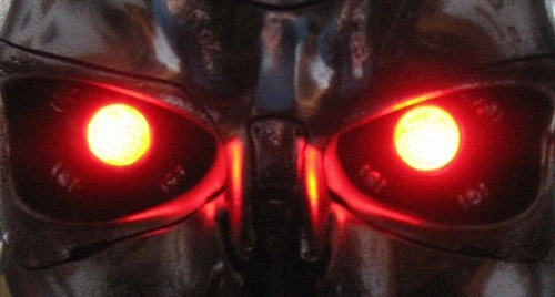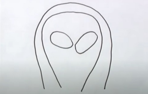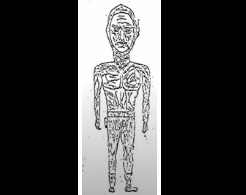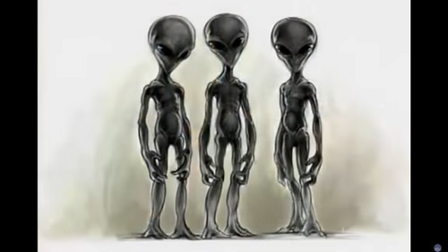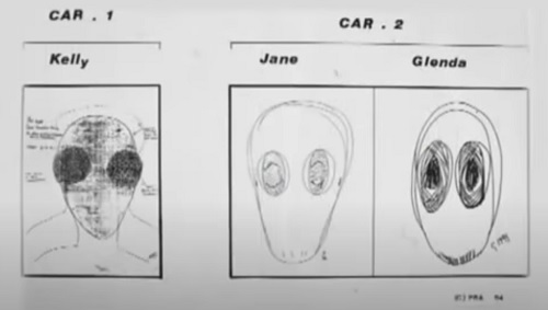 Kun he istuivat kunnioittavan pelon vallassa, yksi hahmoista tuli aluksesta esiin ja lähestyi autoa. Kyseessä oli hopeisiin haalareihin pukeutunut olento, jolla oli läpitunkevat vaaleanpunaiset silmät, mutta ilman pupillejaja iiriksiä. [Linkki Wikipedia: Pupilli] [Linkki Wikipedia: Värikalvo (iiris]