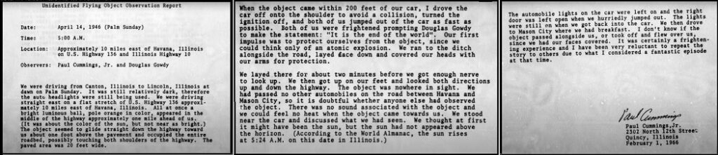 Ben Hansen: Paras arvioni on, että se kapine oli noin 30 jalkaa [9,1 metriä] pitkä. Minua alkoi pelottaa. Se meni pääni ylitse, aavemaisin kapine koskaan. Ääntä ei ollut lainkaan, se risteili / ”kruisaili”. Se oli poissa suunnilleen neljässä tai viidessä sekunnissa.