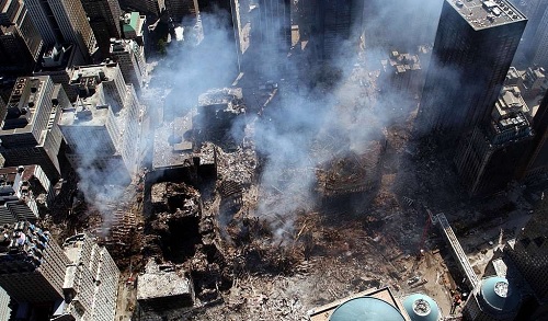 Kuvateksti: Kuva tuhotusta World Trade Centeristä (WTC) vuodelta 2001. [Linkki Wikipedia: World Trade Center (1973 – 2001)] [Linkki Wikipedia: Syyskuun 11. päivän terroriteot]